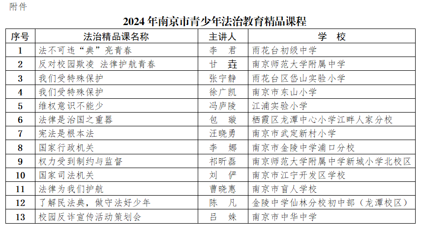 关于公布2024年南京市青少年法治教育课程评审结果的通知