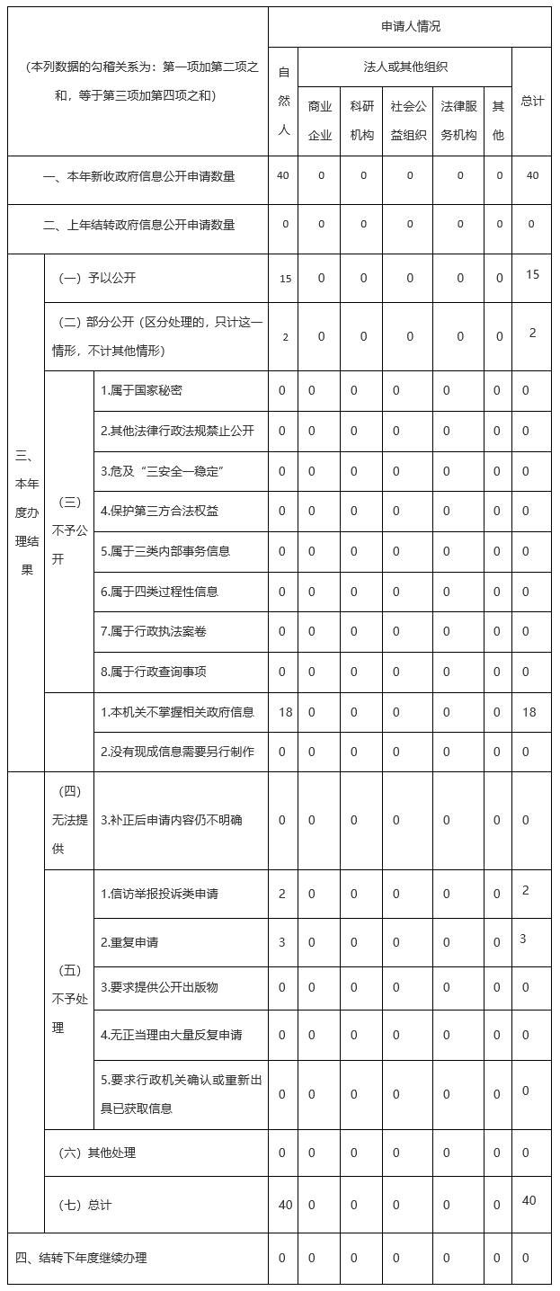 五是依法答复信息公开申请。截至2019年12月31日,收到自然人提起的依申请公开件40件,全部依法按时给予回复。在信息公开申请答复上,同意公开15件,部分公开2件,不掌握的信息18件,信访投诉类2件,重复申请3件。