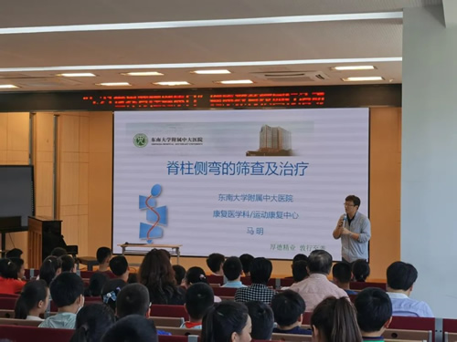 来自中大医院康复医学科的马明主任为学生带来了一场关于脊柱侧弯的筛查及治疗的专业讲座。马主任就认识脊柱、脊柱生长发育过程、脊柱侧弯的原因、主要危害、如何预防等内容展开宣教,通过生动的图文、现场真人演示、互动问答等形式,让学生们了解如何保护脊柱、防治脊柱侧弯。