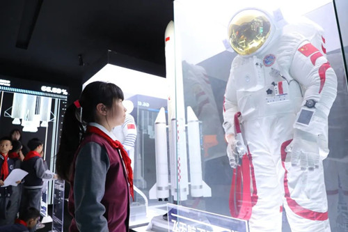 南京市小营小学学生在老师的带领下,前往锦创书城“漫无边界”航天展