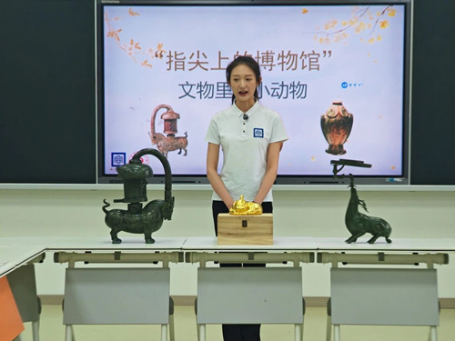 南京博物院社教专员高晗老师担任此次活动的主讲人。在她的引导下,同学们通过亲手触摸鎏金铜鹿灯、藏金兽和错银铜牛釭灯等珍贵文物的复制品,不仅感受到了文物的质感和艺术魅力,还对这些文物的历史背景、文化价值和象征意义有了更为直观的认识。在各位老师的精心组织下,同学们还参与了“东汉错银铜牛灯”的拼图活动。这一环节极大地激发了大家的参与热情,他们在寻找拼图技巧的过程中,有的遇到了挑战,有的则在成功拼出图案后感到无比自豪,整个活动室内充满了欢声笑语和学习的热情。