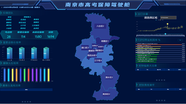 考试期间,市招考院联合南京电信首次架设“高考保障驾驶舱”,直观地展现标准化考点的各种重要数据信息,设备使用情况“一屏了然”。“驾驶舱”通过图形、表格等多种方式实时更新、呈现各区域的考点情况:包括保障团队人员、重要设备在线率、摄像头在线掉线清单、各区域出口流量、带宽利用率等信息。市教育局联合宣传、网信、保密、公安、工信、生态环境、城建委、卫生健康、市场监管、交通、城管、信访、气象、水务、电力、电信等部门,开展“2024高考护航行动”,重点加强考点周边治安、交通、食宿、卫生、降噪等方面的综合保障,周密细致、用心用情做好考生服务工作。考点内外暖心护考。交警驻守考点周边路口,特警、城管、环保、街道等部门定点值守,并巡回检查,确保交通顺畅、考试安全、环境整洁无噪声,突发情况第一时间现场处置。考点内医护人员全程值守,做好医疗救治、心理疏导等工作。