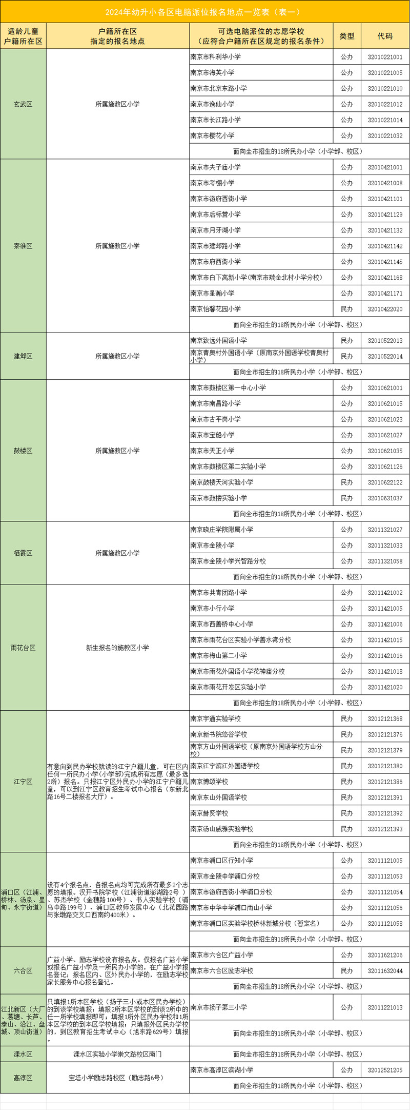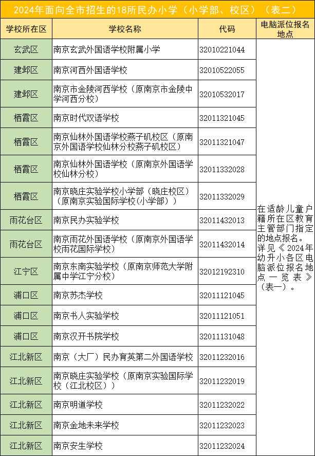 需要提醒的是,今年有18所民办小学(小学部、校区)面向全市招生,监护人不要直接前往这些学校现场报名(除非该校恰好是孩子户籍所在区教育部门指定的报名点)。各区教育部门指定的报名地点见表一,面向全市招生的民办小学见表二。