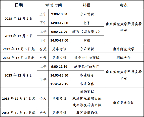 南京考生参加江苏省2024年普通高校招生艺术类专业省统考时间及考点安排表