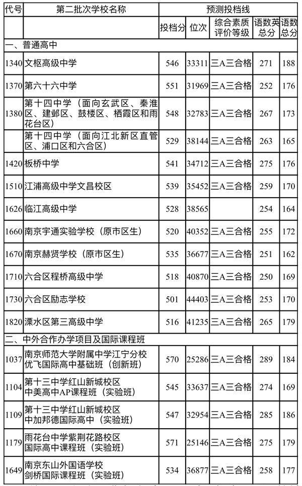 第二批次学校投档控制线为:原市区普通高中518分,浦口区、江宁区、六合区、溧水区、高淳区普通高中由各区教育局划定;中外合作办学项目及国际课程班投档控制线为518分;中职与高职3+3分段培养专业班、综合高中班投档控制线、五年制高职专业班投档控制线420 分(其中护理、助产、师范类专业投档控制线455分);技师学院和高级技工学校技师班及高级技工班投档控制线为400 分。第二批次学校不得录取投档控制线下的考生。